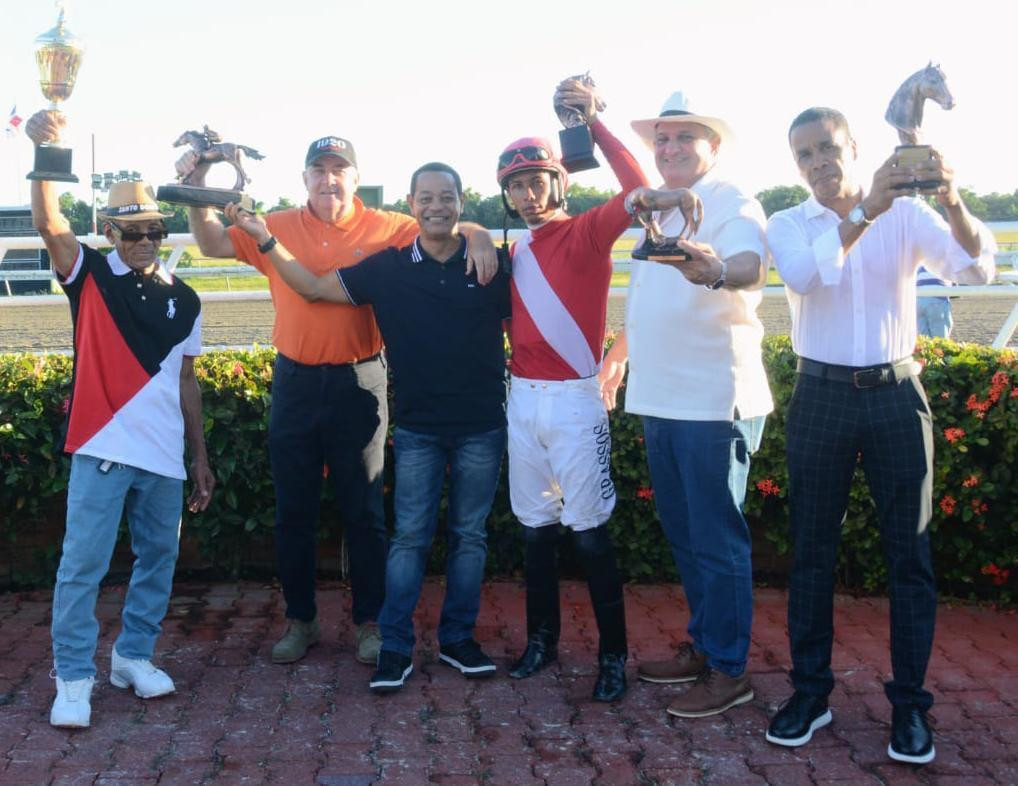 SANTO DOMINGO ESTE.- El periodista dominicano Enrique Rojas (tercero desde la izquierda) figura junto a los receptores de los trofeos por el triunfo del caballo Burlao (4) este sábado en el Hipódromo Quinto Centenario. Desde la izquierda Francisco Lantigua, Alfonso Cochón, Enrique Rojas, el jinete Jesús Frías, Carlos Cochón, y el entrenador Vladimir Reyes.