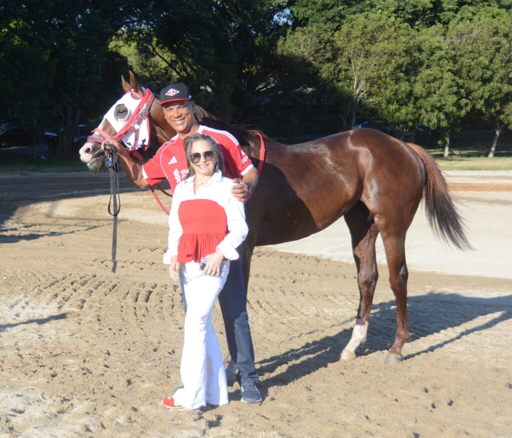 Moisés Alou, dueño y entrenador del caballo Grace From Above, y su esposa Austria Evelin Melo de Alou sostienen al ejemplar después que ganó este sábado el Clásico Día de San Valentín, en el Hipódromo Quinto Centenario. Fue el cuarto clásico que gana el importado de 4 años en la República Dominicana y su novena victoria seguida.