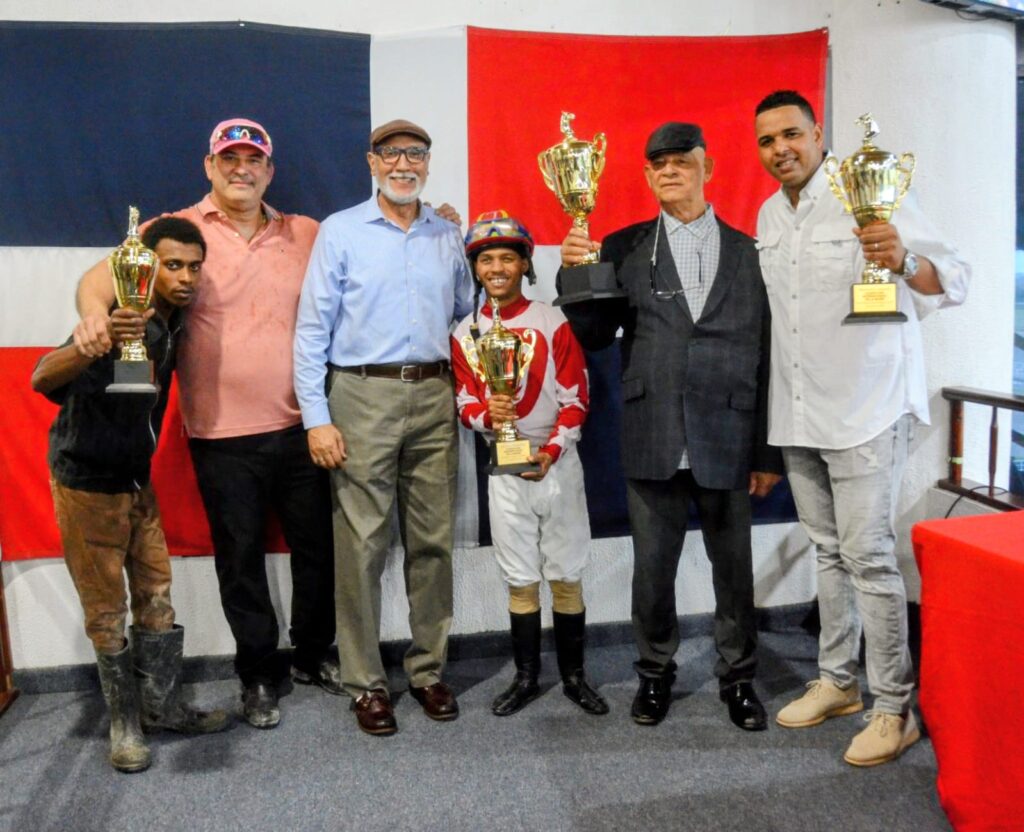 El vicepresidente de la Comisión Hípica Nacional, Radhamés Senra (tercero desde la izquierda), junto a los receptores de los trofeos del Clásico Internacional de la Mujer, disputado este sábado en el Hipódromo Quinto Centenario y el cual ganó la yegua Grateful Lady (1), del Establo Decoo Stable. Desde la izquierda: Juan Pablo Santana (groom); Elvy Decoo (dueño); Senra; Trusman Quevedo (jinete); Jorge Decoo (dueño); Armando E. Pérez (entrenador).