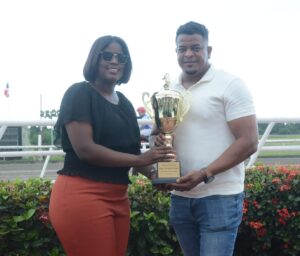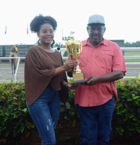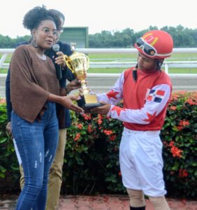 Belky Lluberes (izquierda), del Sea Hípico, entrega a Demetrio A. Corea (derecha) el trofeo al entrenador del ejemplar ganador, Korean’s Girl (2), del Clásico Día de las Secretarias, disputado este sábado (11-4-2026), en el Hipódromo Quinto Centenario.