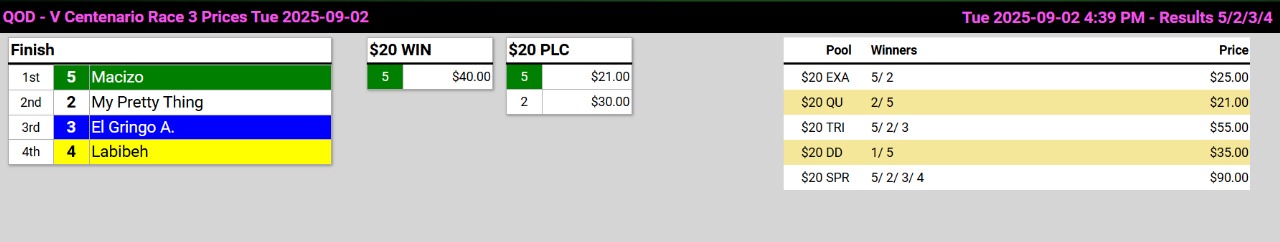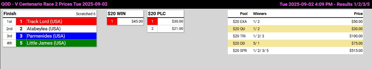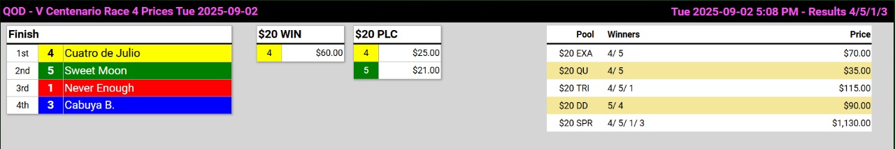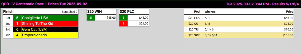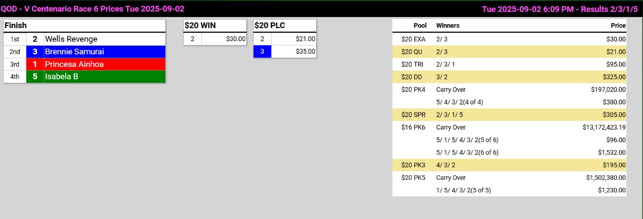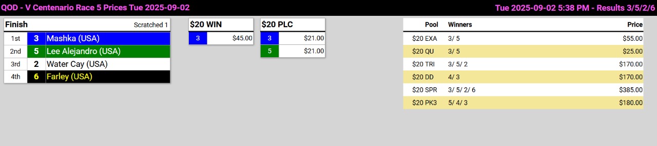 Ganadores (#5 CONIGLIETA (USA), #1 TRACK LORD (USA), #5 MACIZO, #4 CUATRO DE JULIO, #3 MASHKA (USA) y #2 WELLS REVENGE)