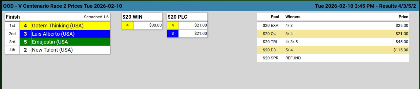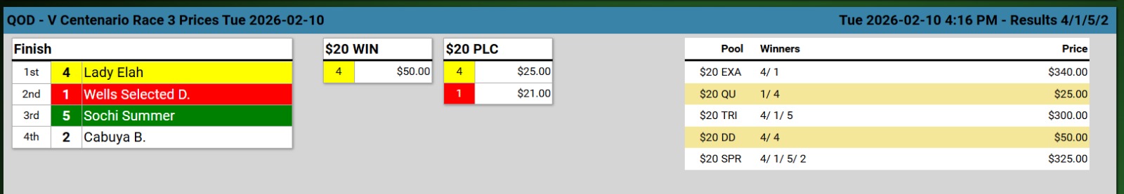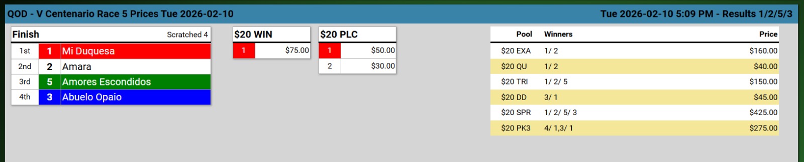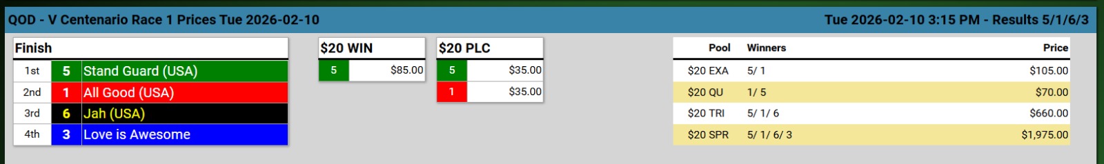 Ganadores (#5 STANDGUARD (USA), #4 GOTEM THINKING USA, #4 LADY ELAH, #3 SHE´S FINE USA, #1 MI DUQUESA (USA) y #5 JAIDEN D.)
